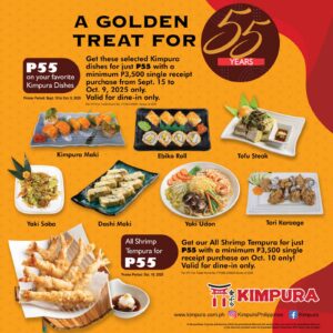 Enjoy specially selected Kimpura favorites for just ₱55 with a minimum single-receipt purchase of ₱3,500 from September 15 to October 9, 2025.