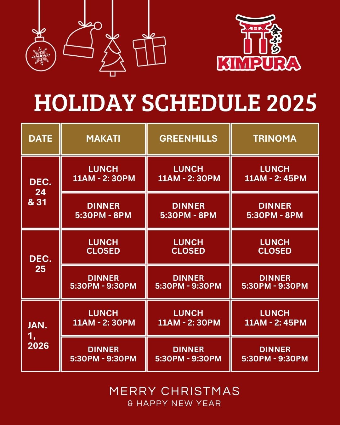Heads up! Here’s our holiday schedule, take a look and plan your visit. Wishing everyone a wonderful holiday season!
